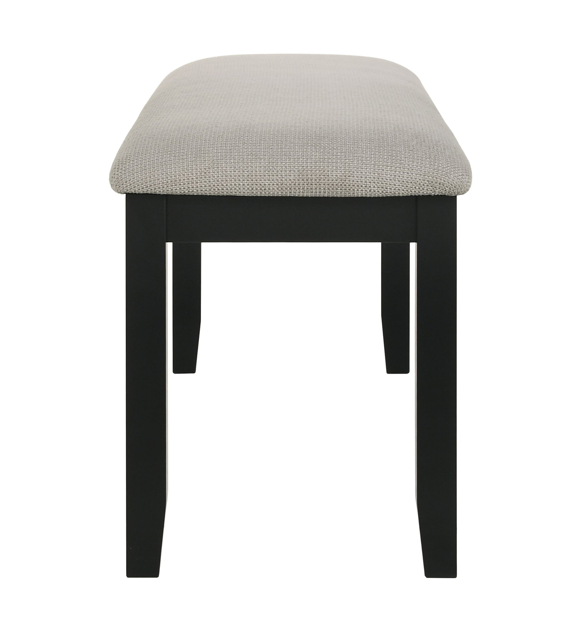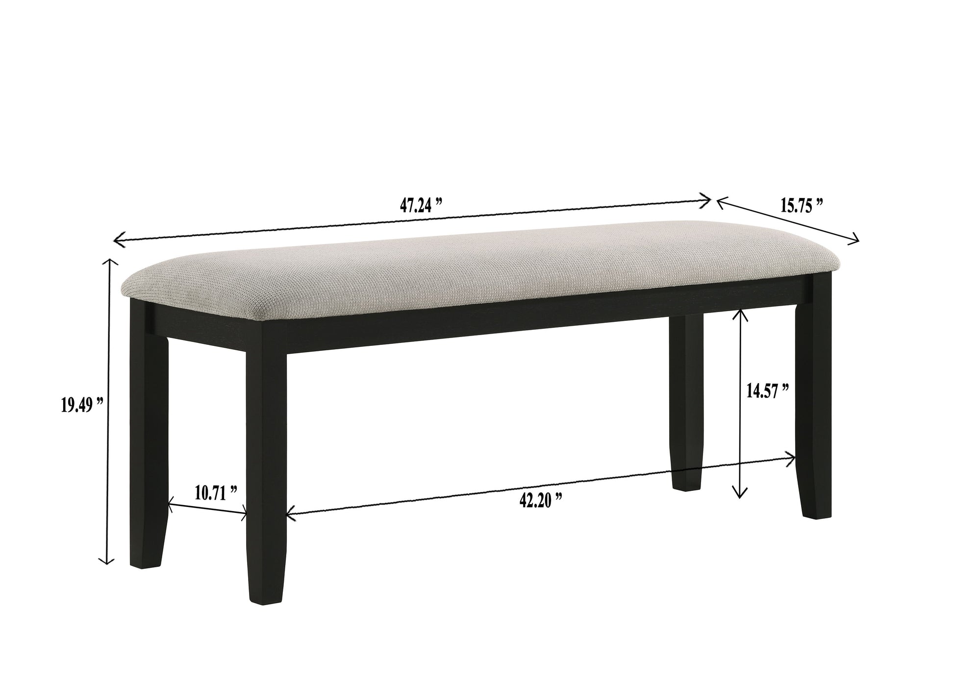 This dining group is the epitome of modern sophistication and functional elegance. The centerpiece is a sleek, rectangular table with a beautifully textured wood grain finish, offering a touch of rustic charm to its contemporary design. The table is complemented by a set of four ladder-back chairs and a versatile bench, all featuring a deep black frame that provides a striking contrast to the neutral, upholstered seats. The cushioned seating ensures comfort, while the bench adds flexibility and a communal feel, perfect for both family meals and entertaining guests. The overall design is enhanced by clean lines and a minimalist aesthetic, making this set a stylish focal point for any dining space.