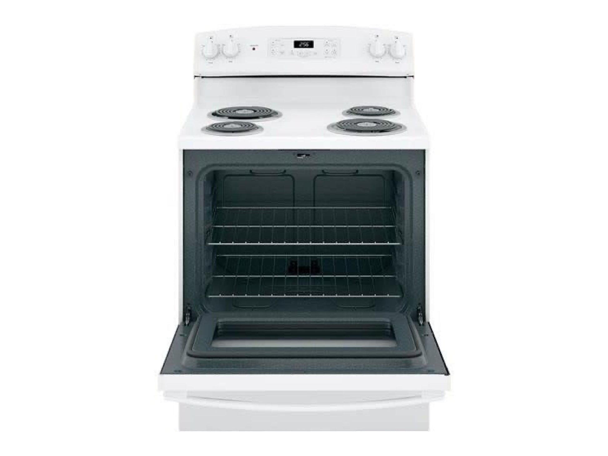 GE 30 Inch Freestanding Electric Range with 4 Coil Elements, 5.0 Cubic Foot Oven, Storage Drawer, Self-Clean Oven, Dual-Element Bake, Electronic Clock, Timer, Sensi-Temp Technology, and Sabbath Mode, Color: White