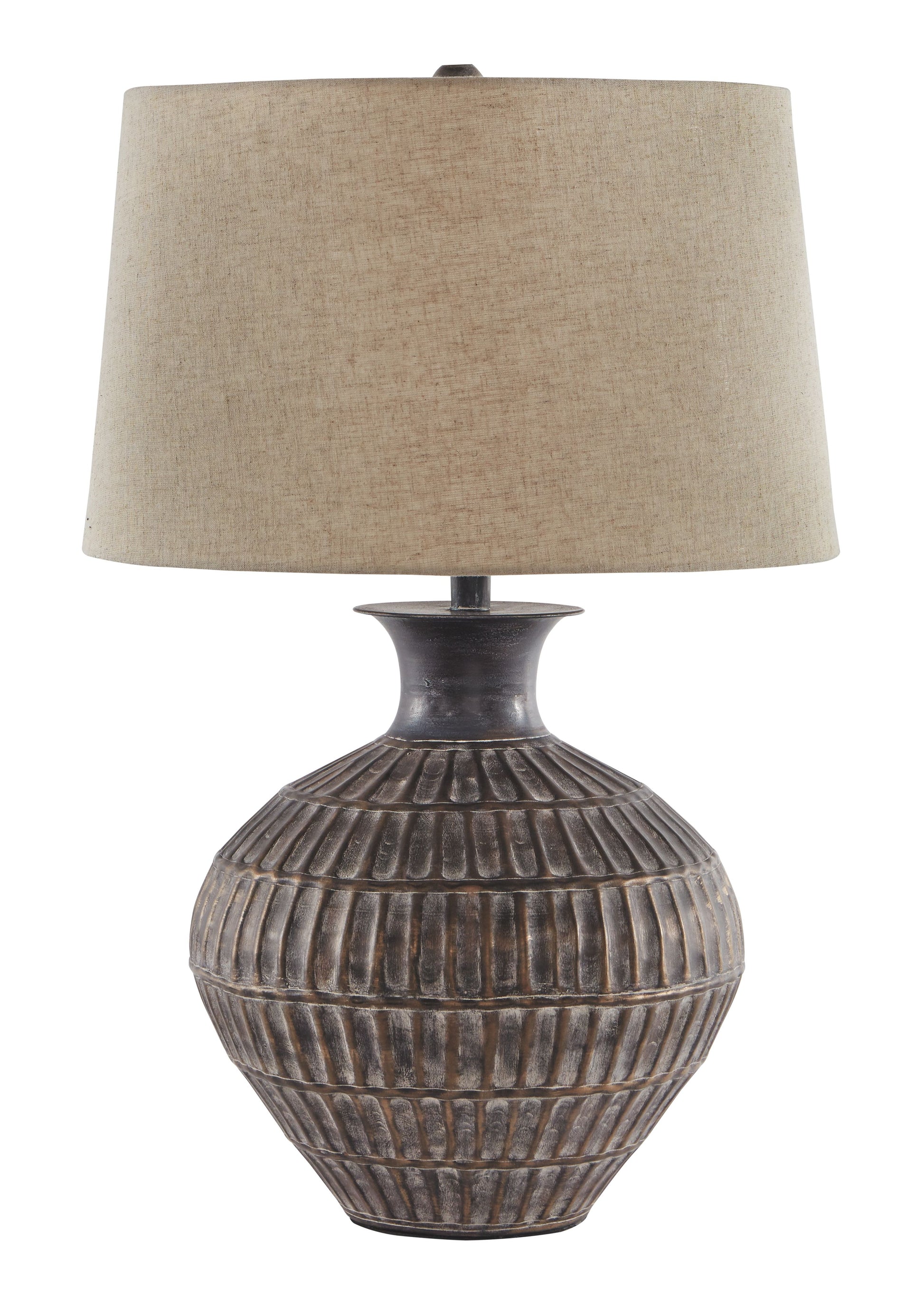 With this table lamp, you can cast a well-lit glow any time of day in style. Its wide, shapely base is teeming with textured metal. The lamp's bronze-tone finish gives that pop of casual chic flair you’ve been looking for.